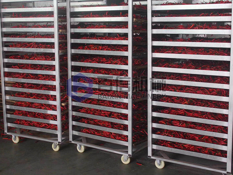 3、二次烘干階段:為保證成品辣椒干貨的品質(zhì),此階段需要辣椒鋪料均勻,堆放不可太厚,保證良好的透氣性,設(shè)置溫度在60~70℃,時(shí)長在6~8個(gè)小時(shí)即可。